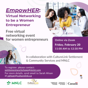 Workshops on settlement-related topics about Information & Orientation, Community Connections, and Employment. Specific topics include immigration, housing, access to community and government programs and benefits, health care, education, employment, life in Ontario, and more.