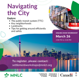 Workshops on settlement-related topics about Information & Orientation, Community Connections, and Employment. Specific topics include immigration, housing, access to community and government programs and benefits, health care, education, employment, life in Ontario, and more.
